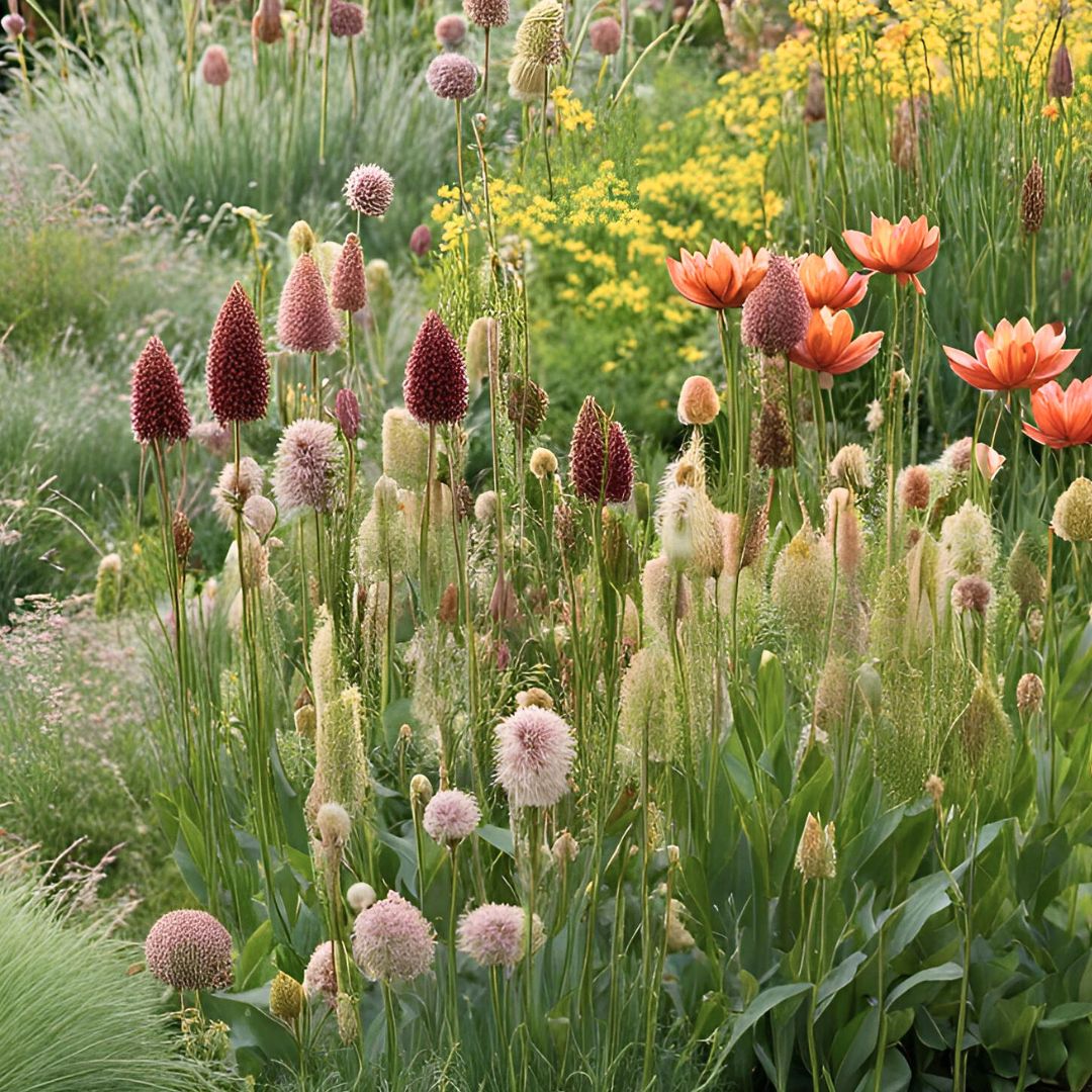 Inspired by the Bradbury Building's rich hues, this modular garden intertwines the deep mauves of clusters of Mountain Lotus and Checkered Lily with the purple and taupe tones of Milkweed and Indian Warrior, creating a captivating tapestry of complementary shades that dance across your garden bed. Embracing the natural rhythm of the seasons, a selection of Fall/Winter bloomers ensures a perennial spectacle as each species takes its turn to flourish in the spotlight. Delight in the tactile wonders of Meadow Barley and Coralroot, where velvety seedpods and spiky fronds mingle, offering a sensory journey through your garden. The arrangement of towering foliage and blooms, alongside sprawling ground cover, orchestrates a visual crescendo that delights from every angle.