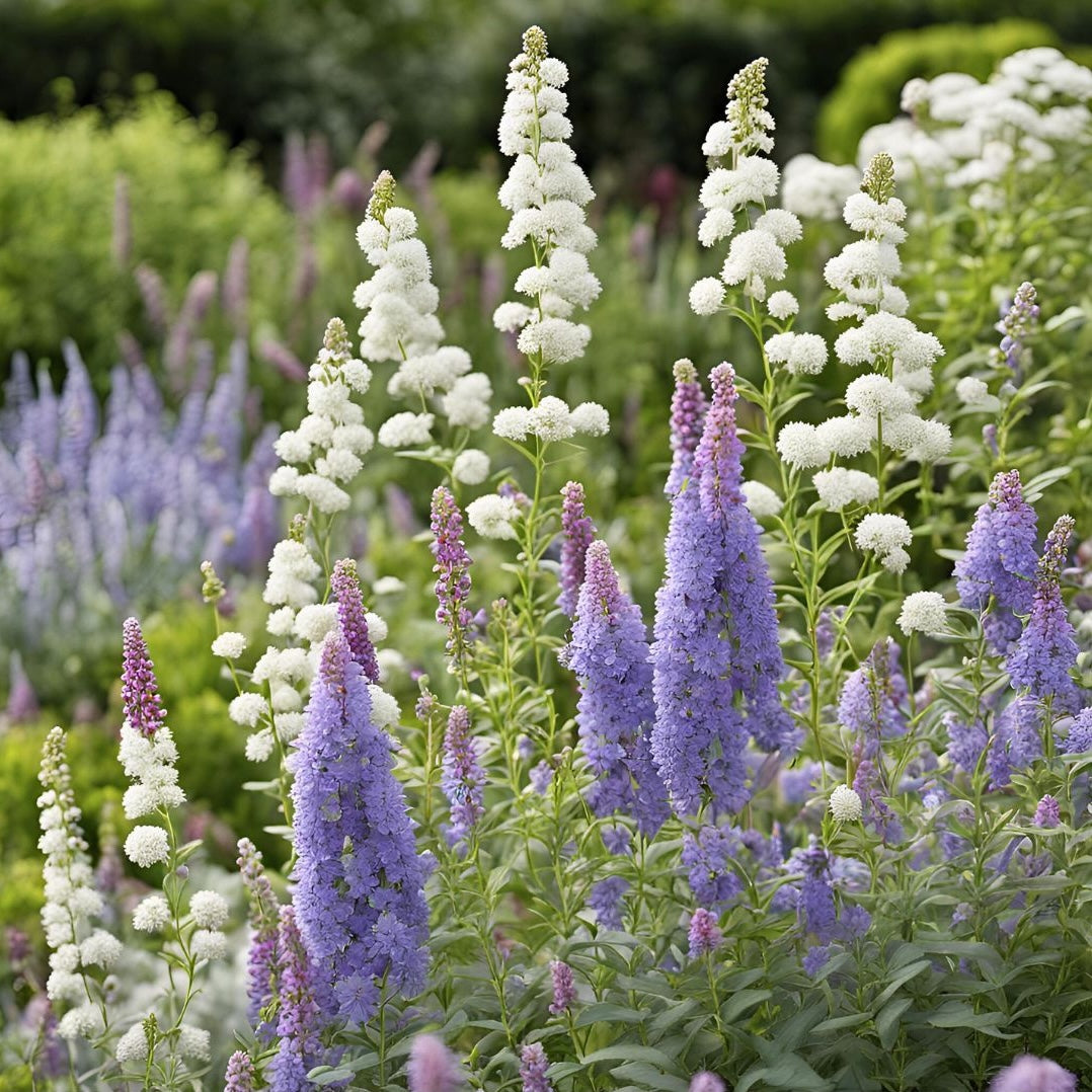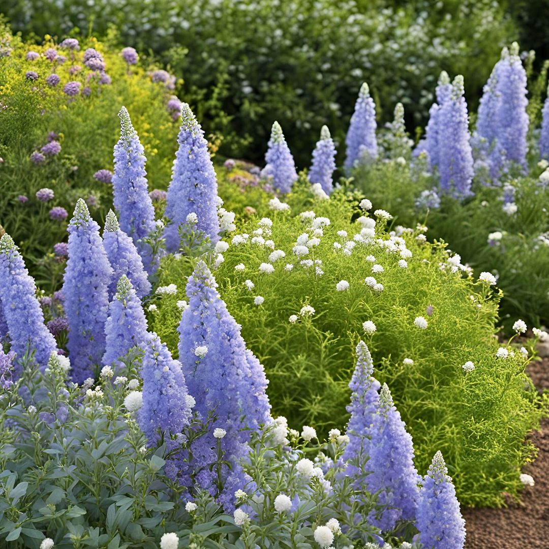 Heavy on pollinators like Penstemon rattanii (A) that graces the scene with elegance, its slender stems adorned in delicate purple blooms, while Delphinium parryi (B) stands tall, its vibrant blue spikes reaching skyward like miniature spotlights. Lupinus polyphyllus burkei (C) and excubitus (E) carpet the ground in a rich indigo sea, while their nitrogen-fixing abilities guarantee no fertilizing needed for their neighbors. The electric blue hues of Ceanothus tementosus (D) dance in the breeze, offering a dazzling display against the backdrop of lush foliage, while Dichelostemma capitatium (F) sways gently, its delicate blue-pink blossoms reminiscent of confetti raining down on a Hollywood premiere. Phacelia bolanderi (B) and Salvia apiana (H) fill the air with their fragrant blooms, infusing the garden with the sweet scent of success.