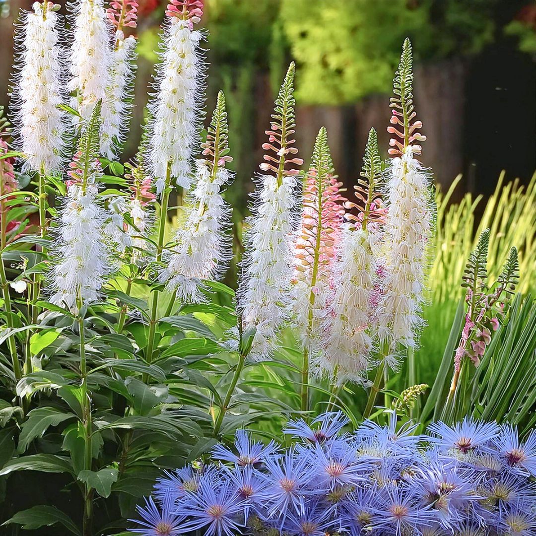At the heart of our garden, inspired by the illustrious Hollywood Sign, stands I. Romneya coulteri, its grand presence commanding attention with large, papery white flowers reminiscent of oversized film reels. Entwined with it, J. Calystegia macrostegia's white trumpet-like blossoms delicately weave through the garden, evoking a shimmering ribbon of stardust. Around this captivating centerpiece, a symphony of color and whimsy unfolds.