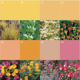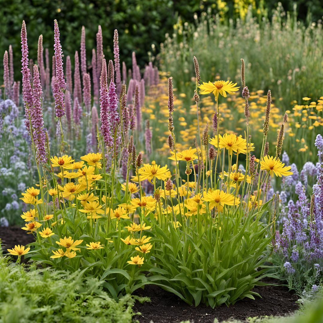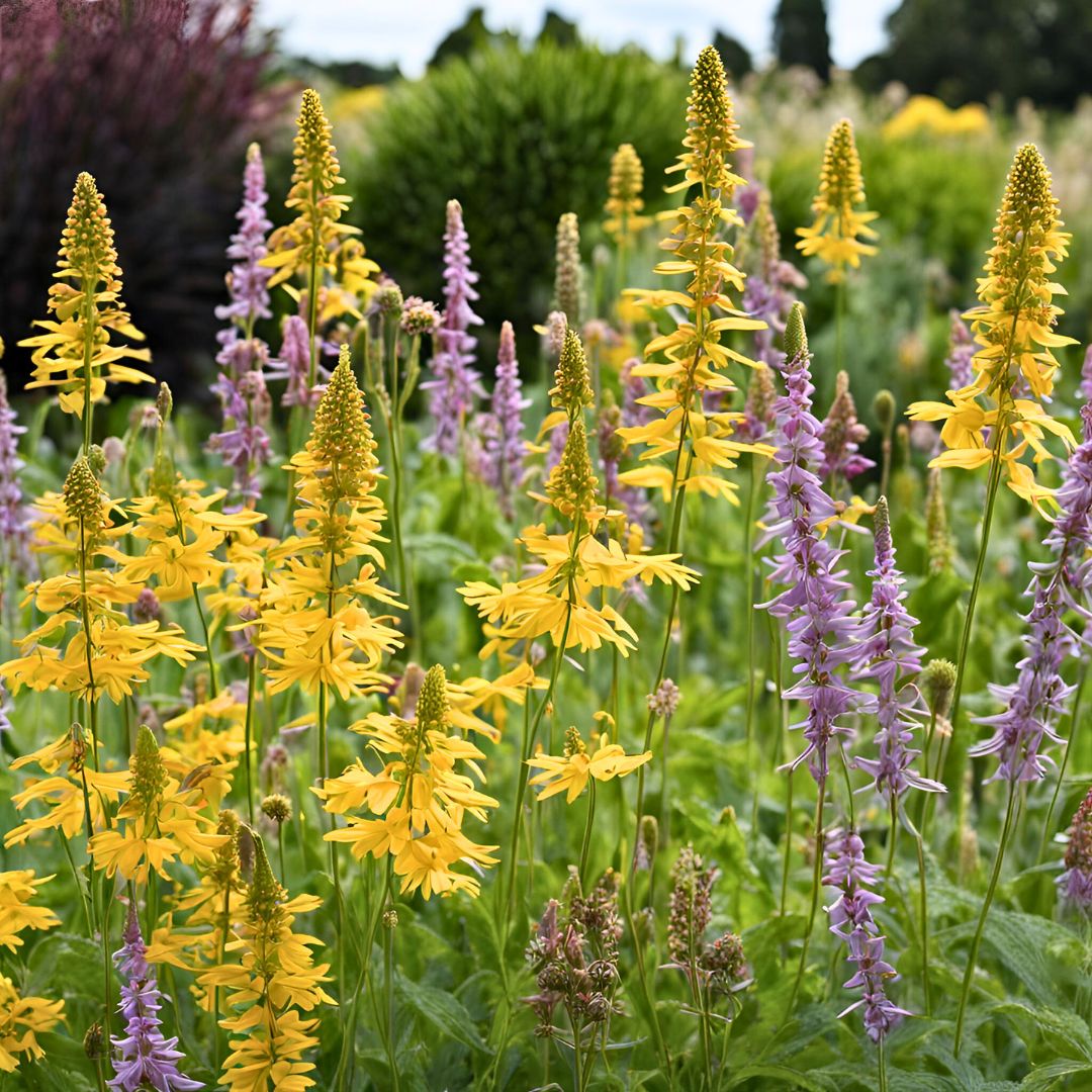 In a garden inspired by the breathtaking hues of a Joshua Tree National Park sunset, an enchanting tapestry of colors unfolds. Melical imperfecta, with it's delicate stems adorned in feathery plumes of gold, dances in the evening breeze, echoing the warm glow of the fading sun. Salvia spathacea yellow adds vibrant pops of yellow, reminiscent of the radiant hues that streak across the sky, while Triteleia ixidiodes blooms in shades of peach and coral, mirroring the soft pastels of twilight. Amidst this harmonious symphony of colors, Helenium puberulum bursts forth with fiery orange blooms, evoking the fiery intensity of the setting sun. Lotus fomosissimus unfurls its velvety crimson petals, adding depth and richness to the garden palette, while Diplacus aurantiacus paints the landscape with shades of orange and gold, reminiscent of the desert's rugged beauty and Heuchera maxima adds a touch of elegance with its silvery foliage tinged with pink. Together, these plants create a garden oasis that captures the magic and allure of a Joshua Tree National Park sunset.