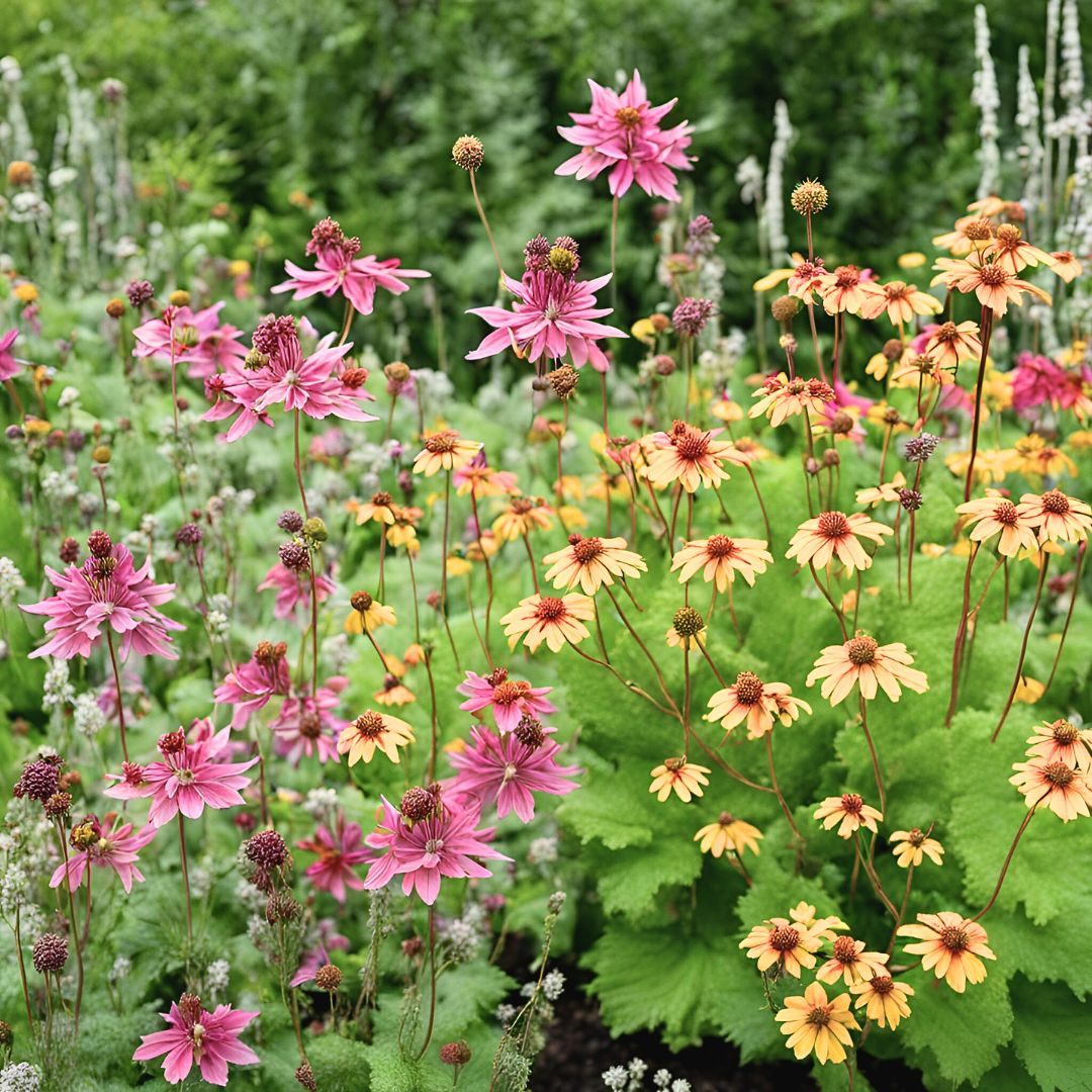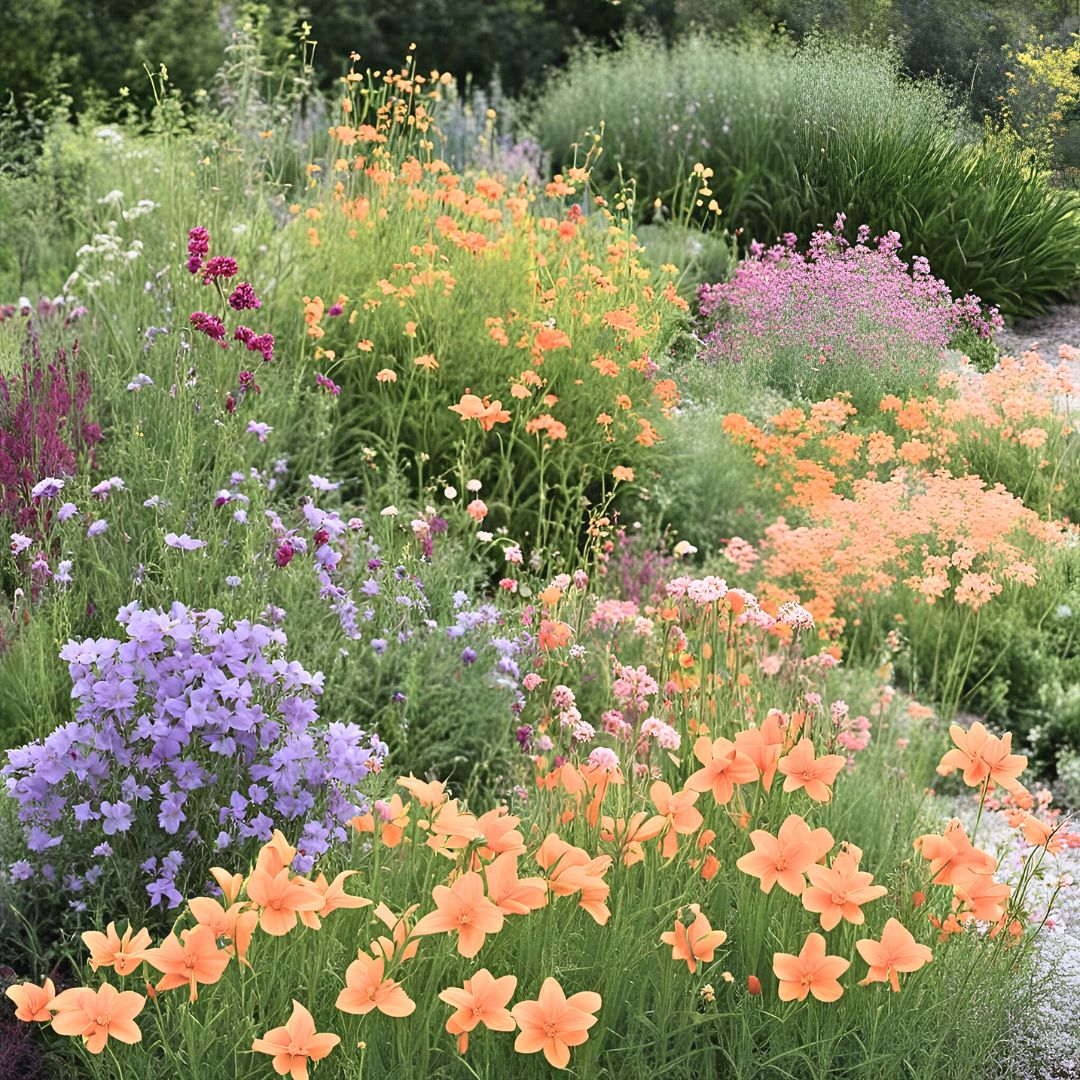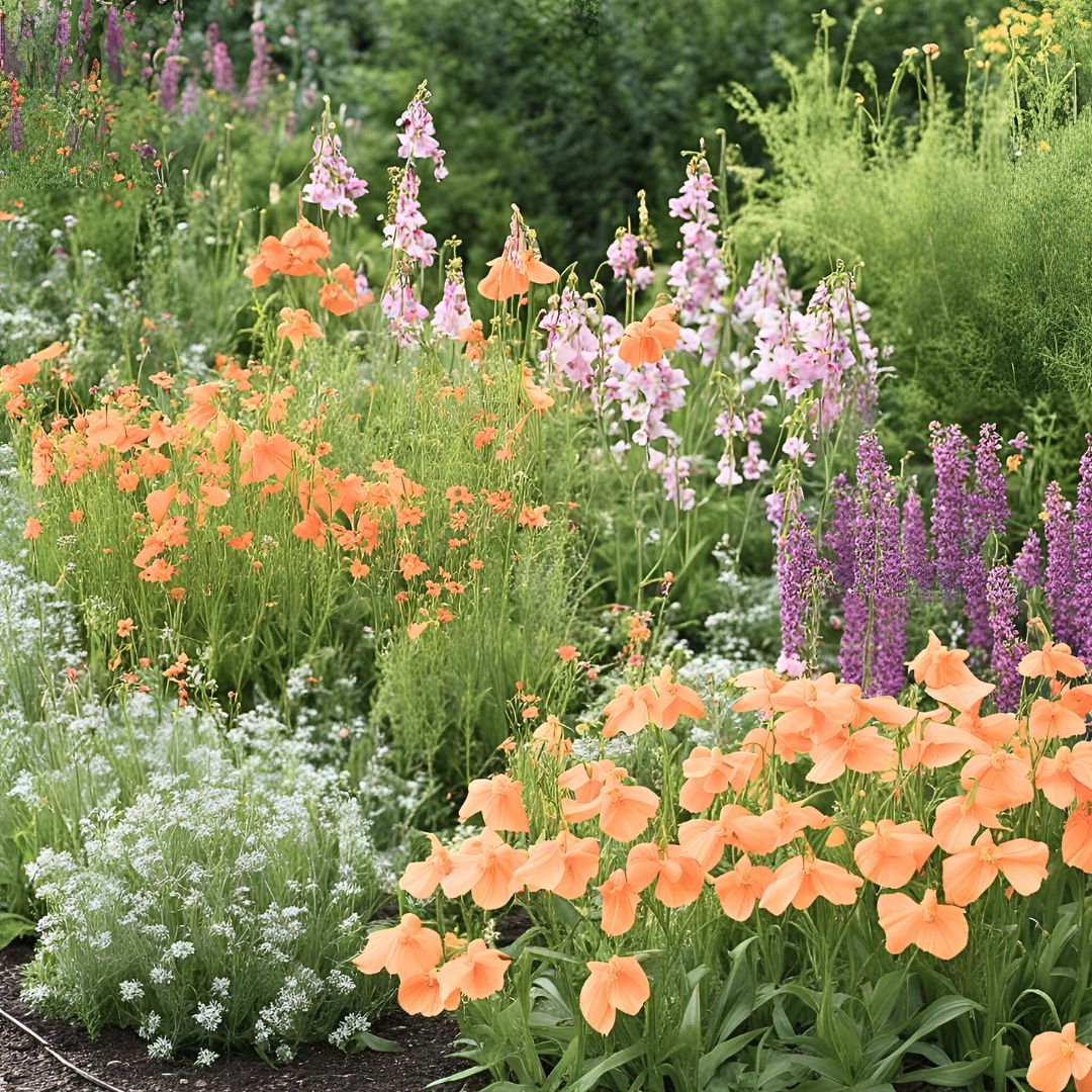 Crafting this garden was no small feat, but the challenge makes it one of our most cherished creations. Anchored by the vibrant presence of two orange Monkey Flower species (C, D), we've expertly balanced and softened their boldness with a delicate interplay of yellows, peaches, and burnt oranges. Infused with a spirit of fun and whimsy, while also imbuing a sense of warmth and tranquility, the addition of deeper butterscotch, creamsicle, peach, and cantaloupe species brings depth to the palette.