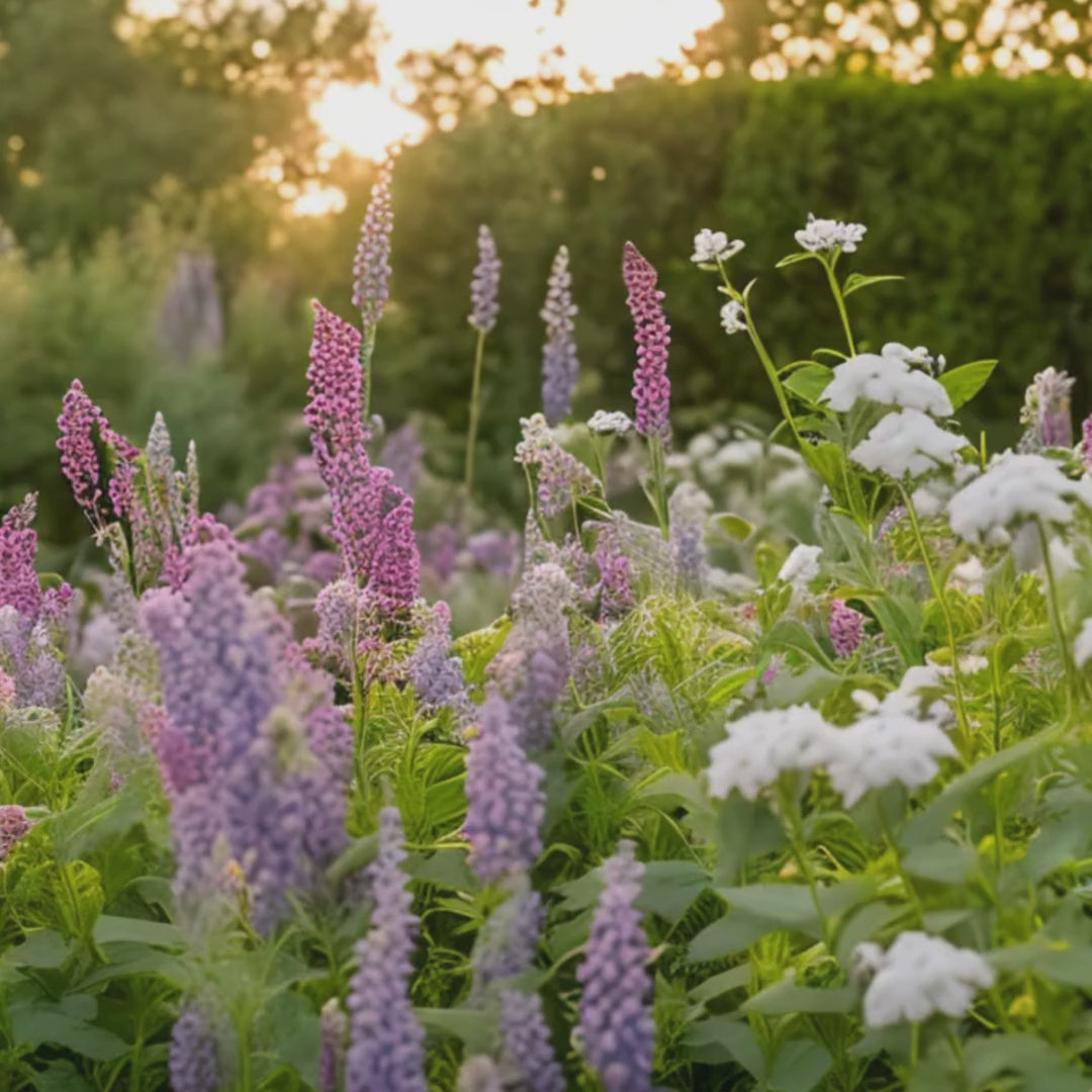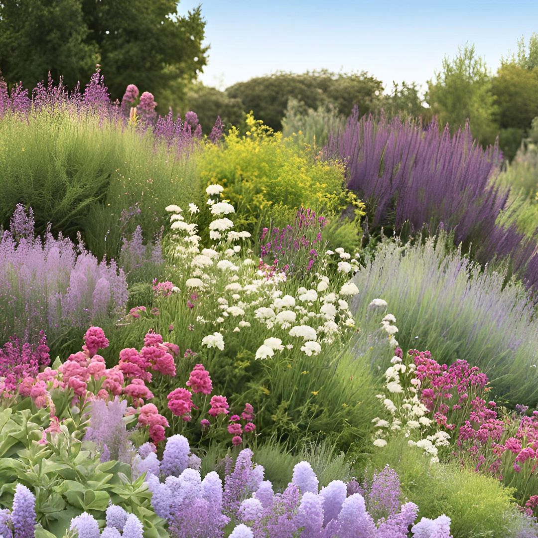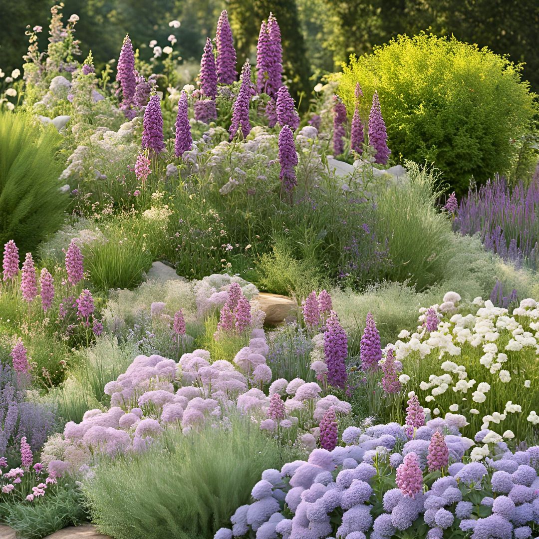In this vibrant garden tableau, a kaleidoscope of colors, heights, and textures dance together in perfect harmony. Towering above the rest, the majestic Ceanothus (A) stands sentinel, its cascading branches adorned with clusters of azure blooms, offering a striking contrast against the backdrop of lush green foliage. Nearby, Salvia 'Bees Bliss' (B) blankets the ground with a profusion of lavender-hued flowers, its aromatic leaves adding texture and interest to the scene. Penstemon procerus (C) adds vertical accents with its slender stems topped by clusters of tubular lavender blossoms, while Salvia leucophylla (D) spreads its silvery foliage like a delicate veil, punctuated by spikes of pale lavender flowers.