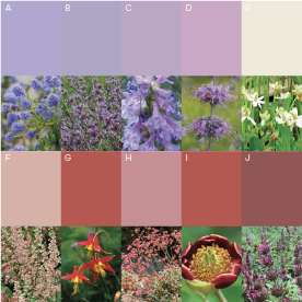 Anemopsis californica (E) adds a touch of whimsy with its unusual white flowers resembling cotton balls, while Heuchera maxima (F) provides a pop of color with its paler pinkish blooms nestled among its mounding foliage. Western columbine (G) adds a splash of drama with its nodding red flowers, dangling like jewels from its slender stems, while Eriogonum rubescens (H) boasts clusters of tiny mauve flowers atop its wiry branches. Paeonia californica (I) steals the show with its showy red blooms, their velvety petals a feast for the eyes, while Salvia spathacea (J) completes the ensemble with its spikes of deep magentaflowers, adding a final flourish of color to this enchanting garden scene.
